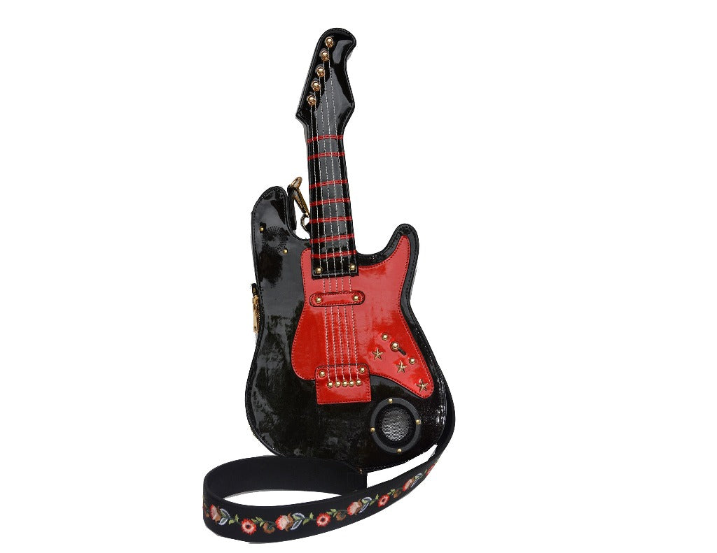 Black/Red Guitar Shaped Shoulder Bags Multimedia Bluetooth/Speaker.